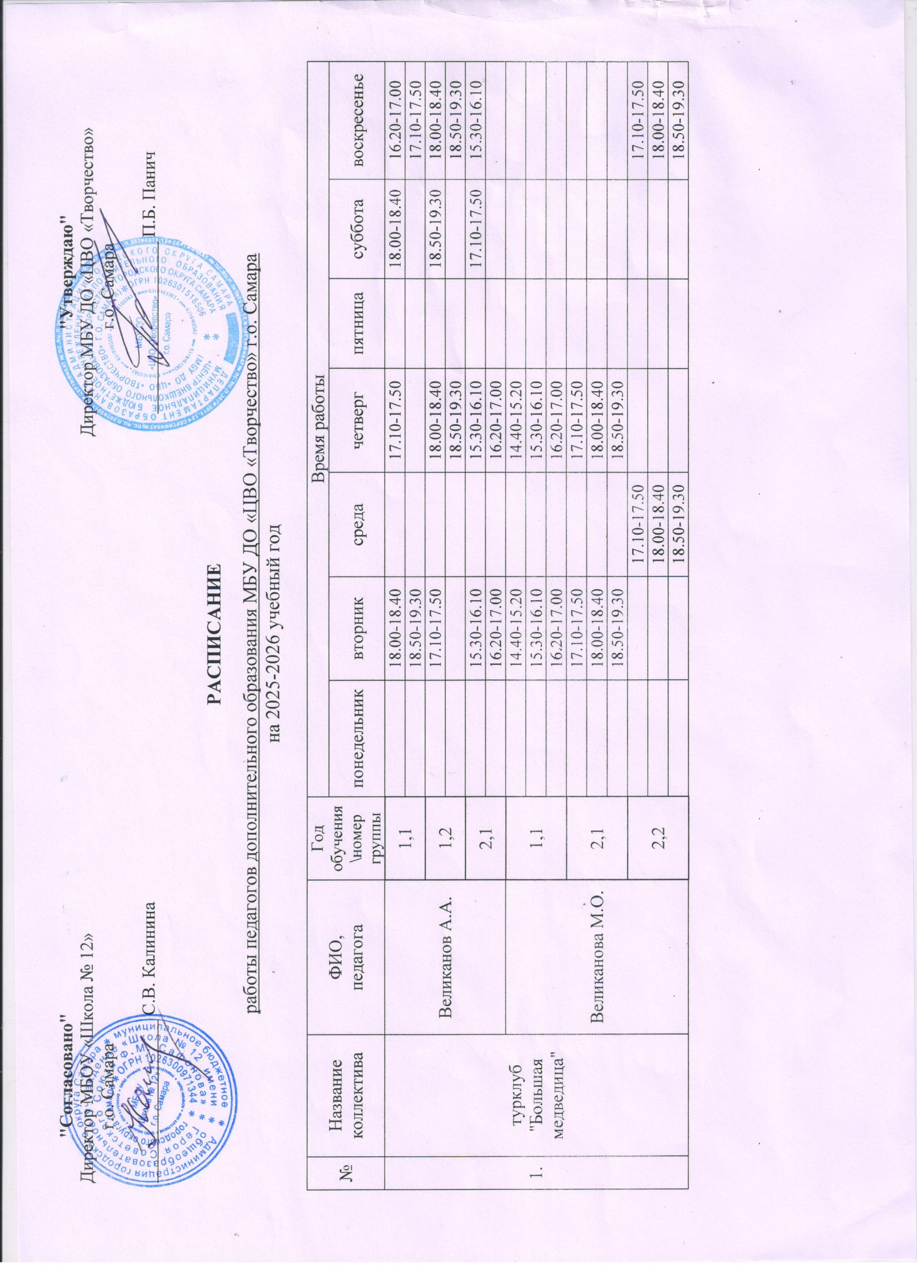 Расписание работы педагогов доп. обр. МБОУ ДО ЦВО «Творчество» г.о. Самара на 2025-2026 уч. год