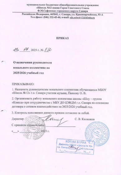 Приказ о назначении руководителя вокального коллектива на 2025-2026 учебный год