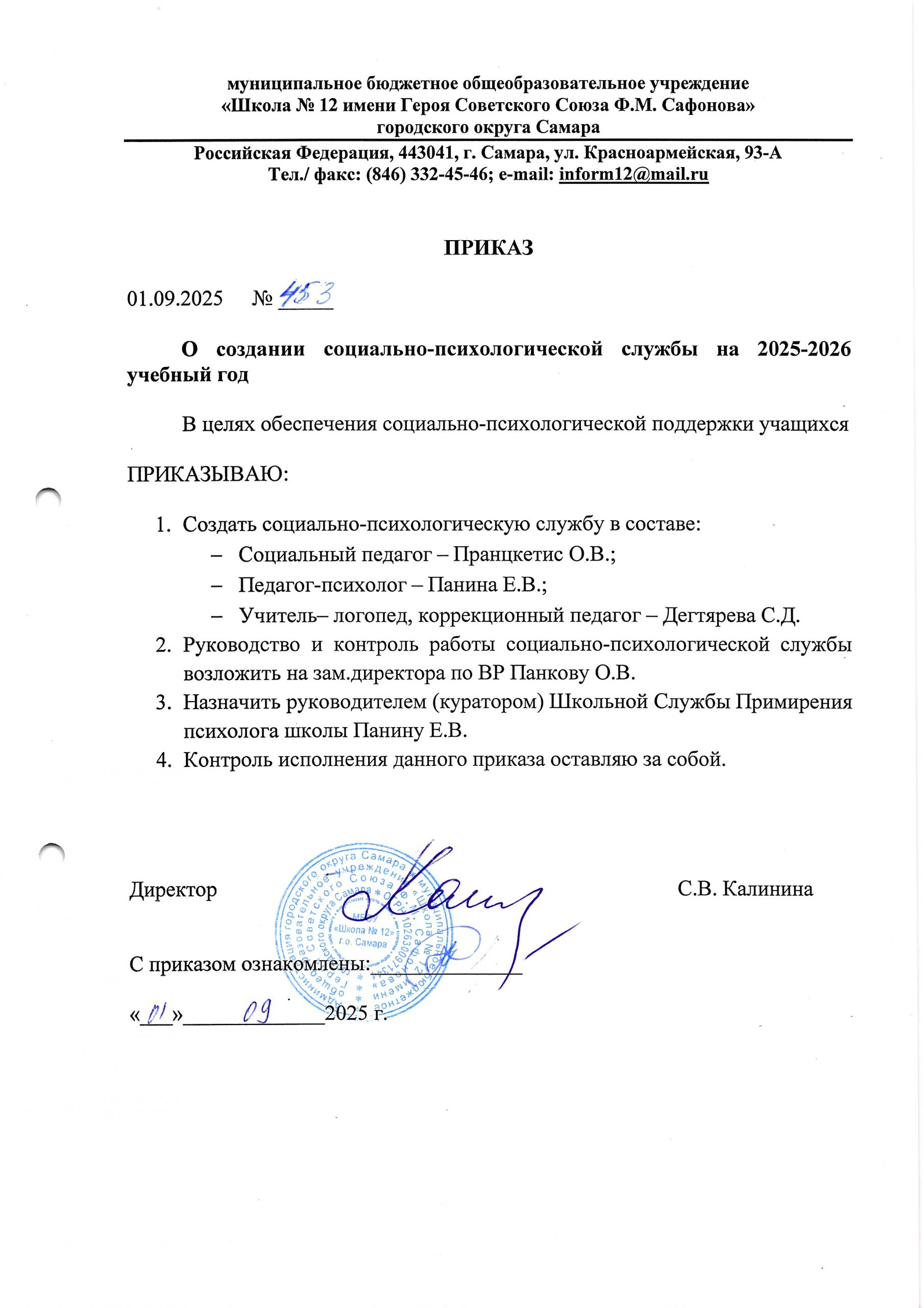 Приказ о создании социально-психологической службы на 2025-2026 учебный год